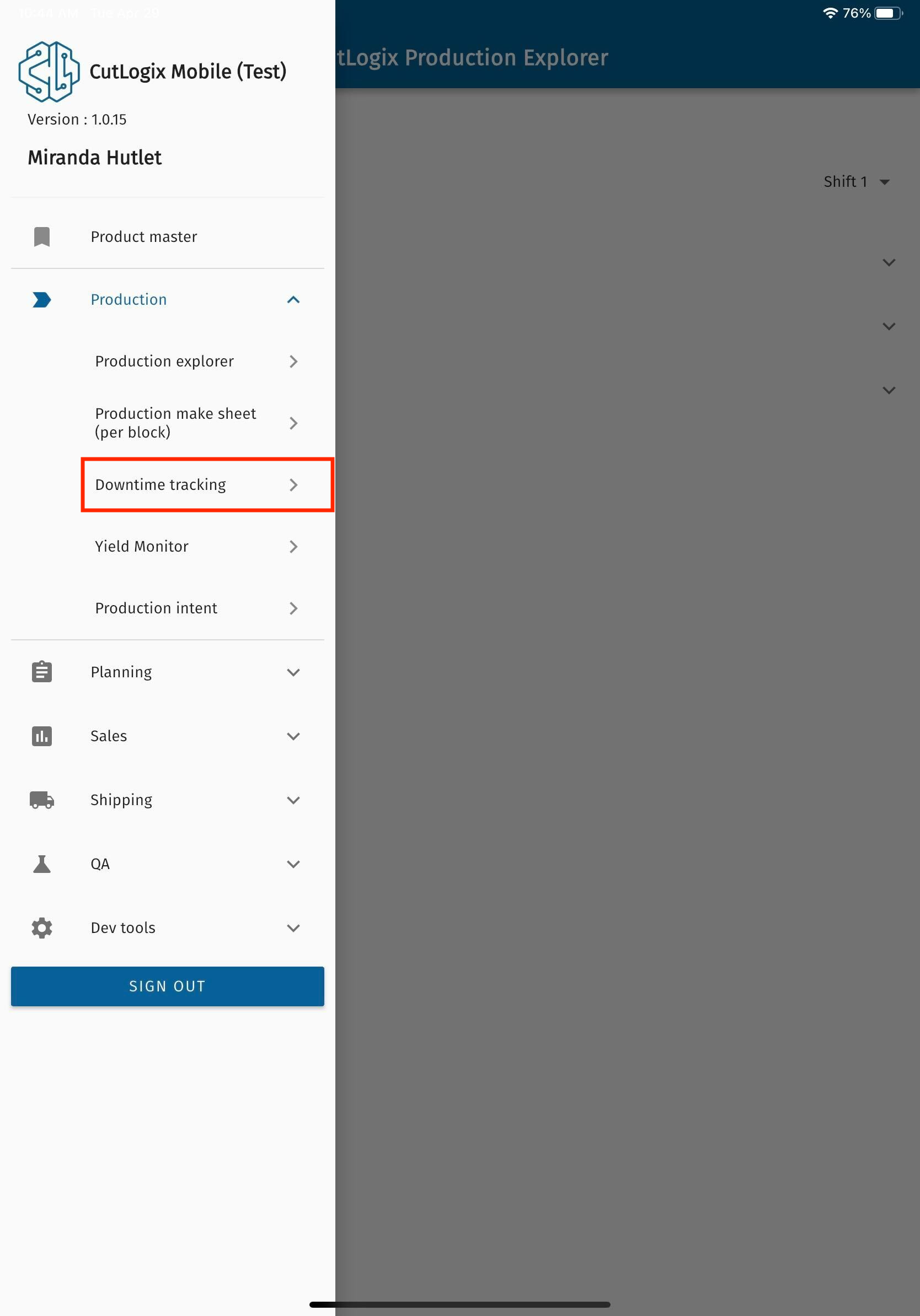 DemoStep 1: In CutLogix mobile, open the “Production” menu and click on the “Downtime Tracking” option in the menu.