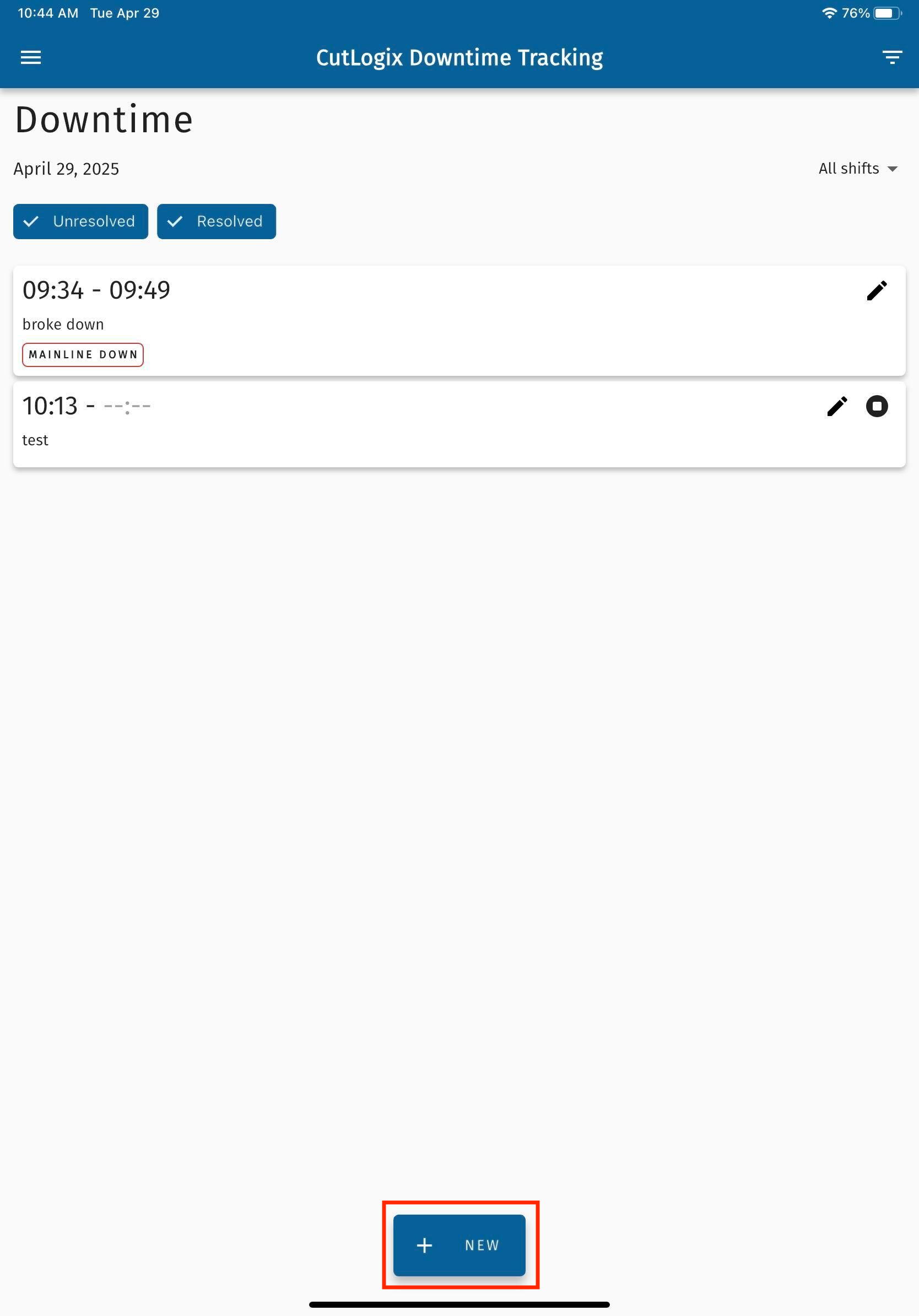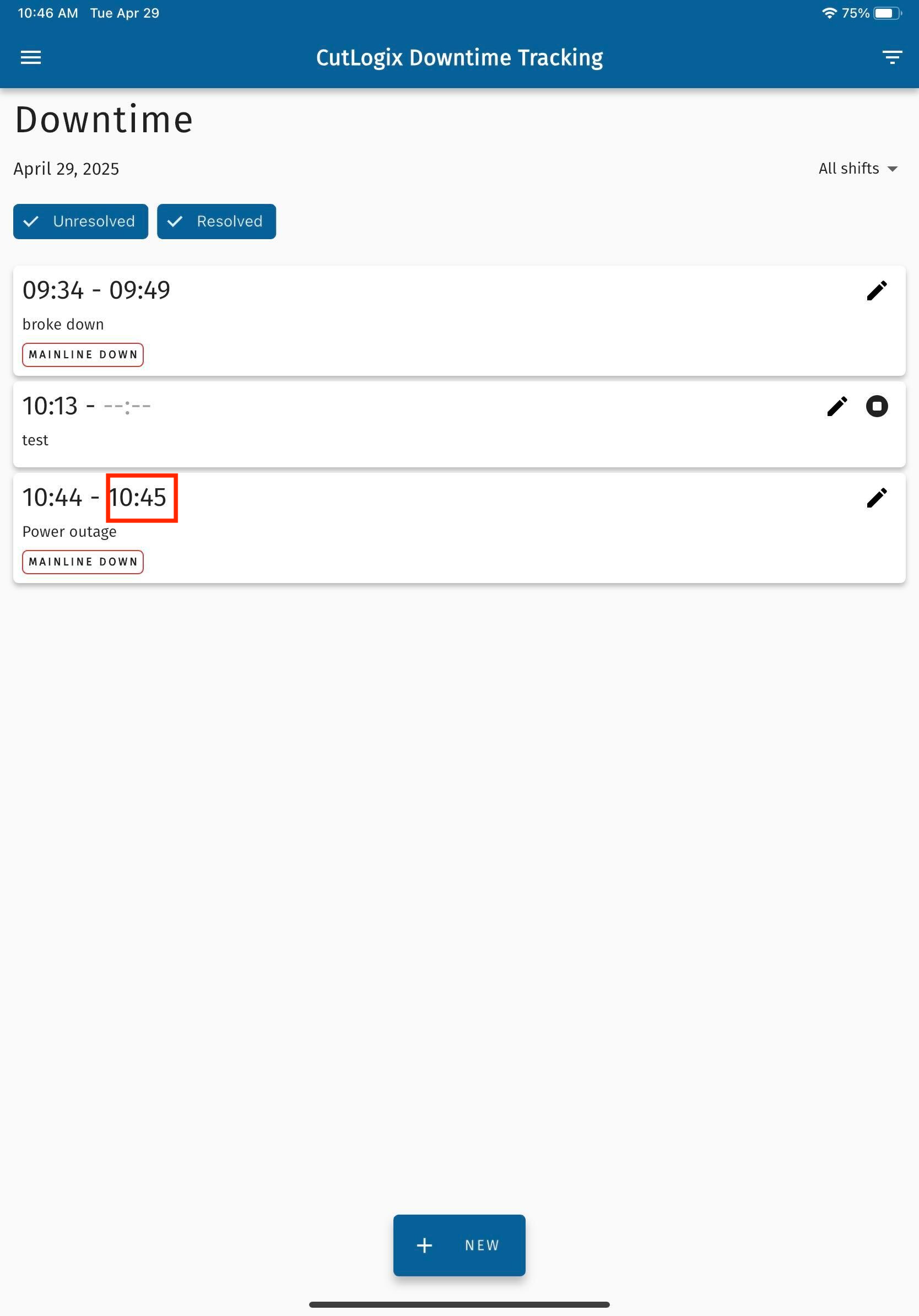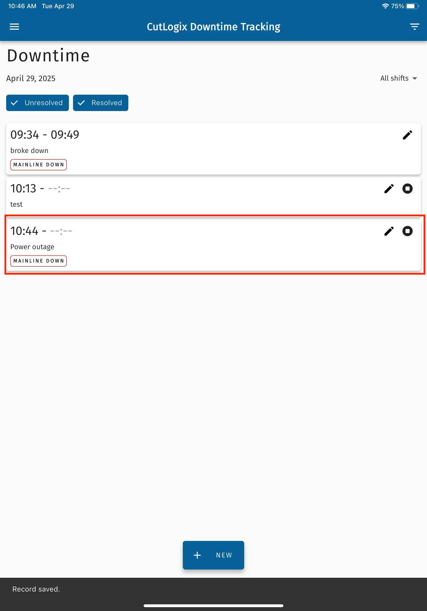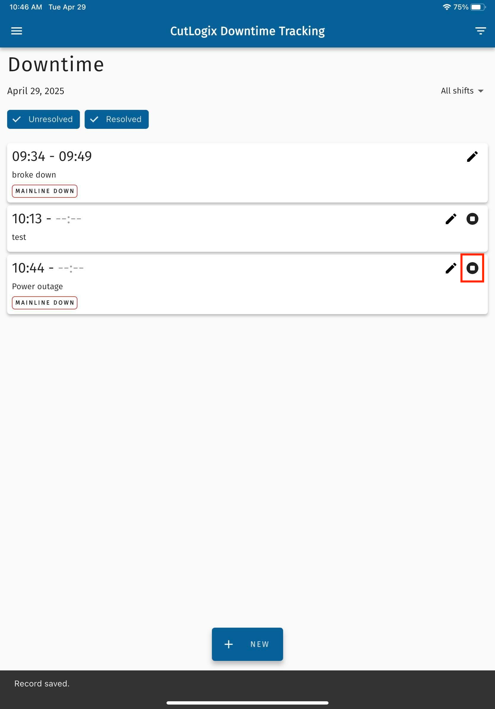 NOTE: When downtime records are created & saved in the CutLogix mobile app, a timer starts for them if no end time was specified on the downtime record. The next step outlines how to stop the timer once the downtime is over.