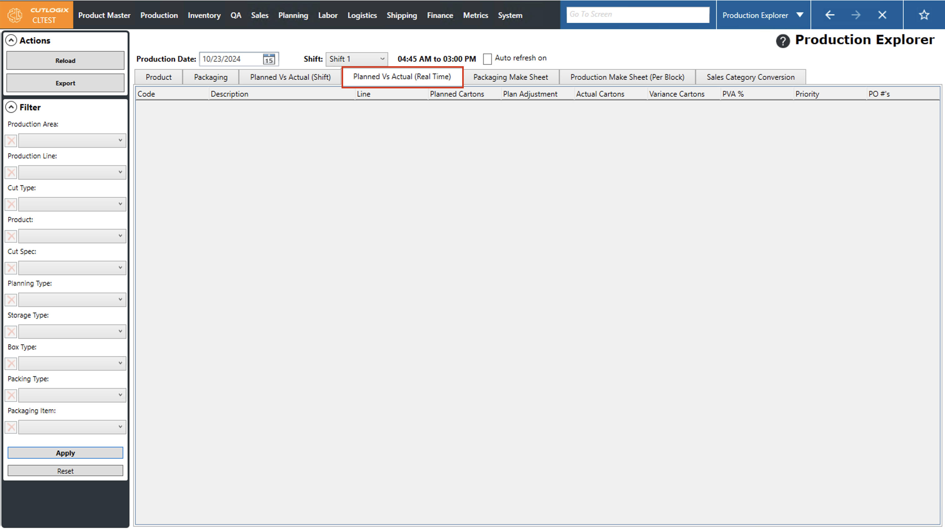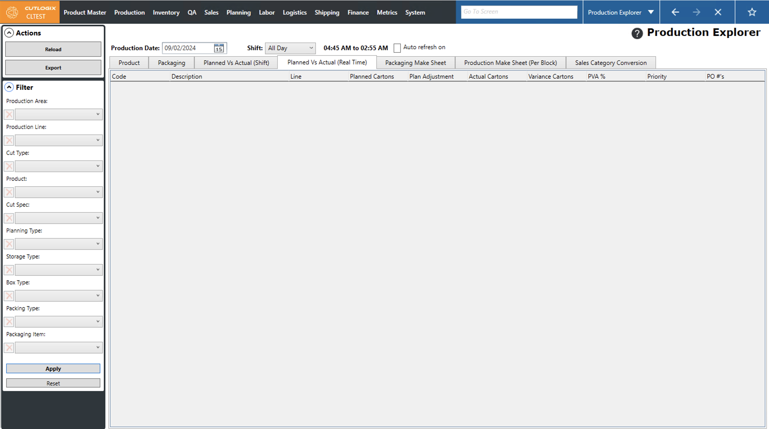 Step 4: Now we'll view the planned vs actual in realtime. To do this click on the "Planned Vs Actual (Real Time)" tab, then select the date that you want to view production for. Then click "Reload" in the actions panel. This will show us what has been produced vs what should have been produced for the whole day that is selected.