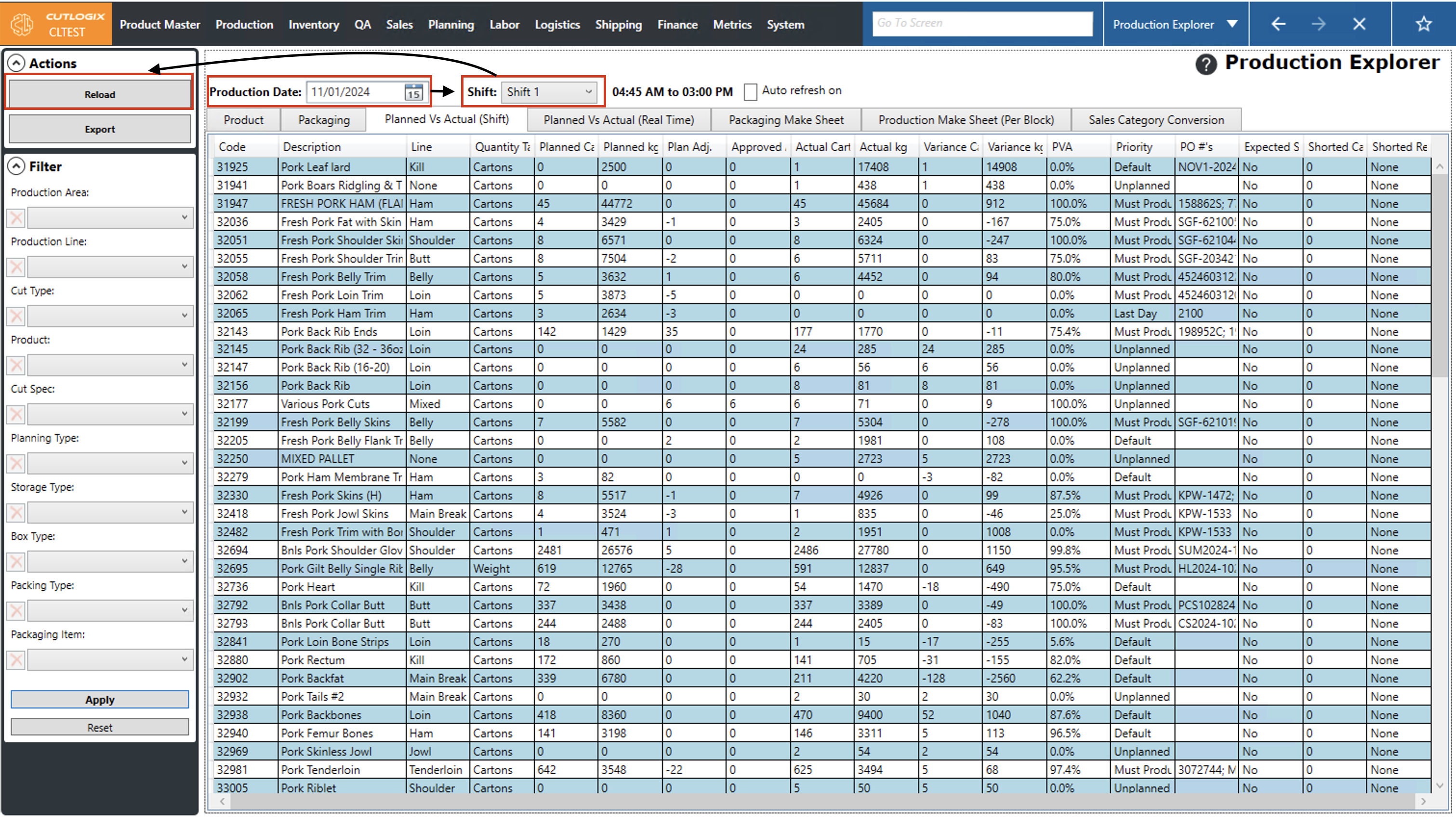Step 2: By default the production date is set to the current day & shift 1. This can be changed to view the planned vs actual for the date & shift that you want to see by clicking on the datepicker beside "Production Date" and choosing a different date, and choosing the shift that you want from the "Shift" dropdown. Click "Reload" after changing the date and shift so CutLogix can display the requested information for the chosen date & shift.