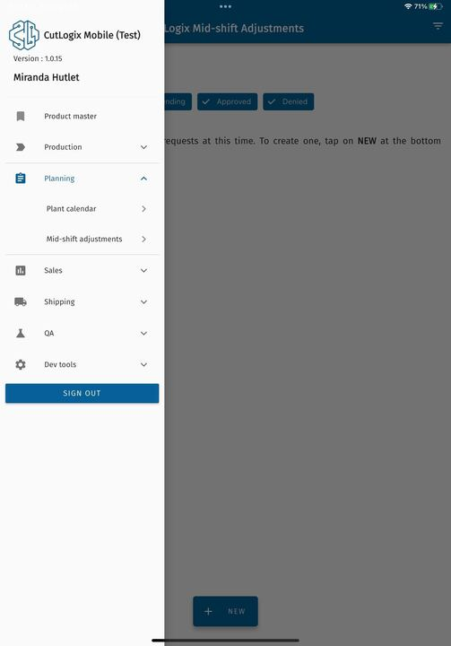 DemoStep 1: In the CutLogix mobile app, open the “Planning” menu, then click on “Mid-shift Adjustments”.