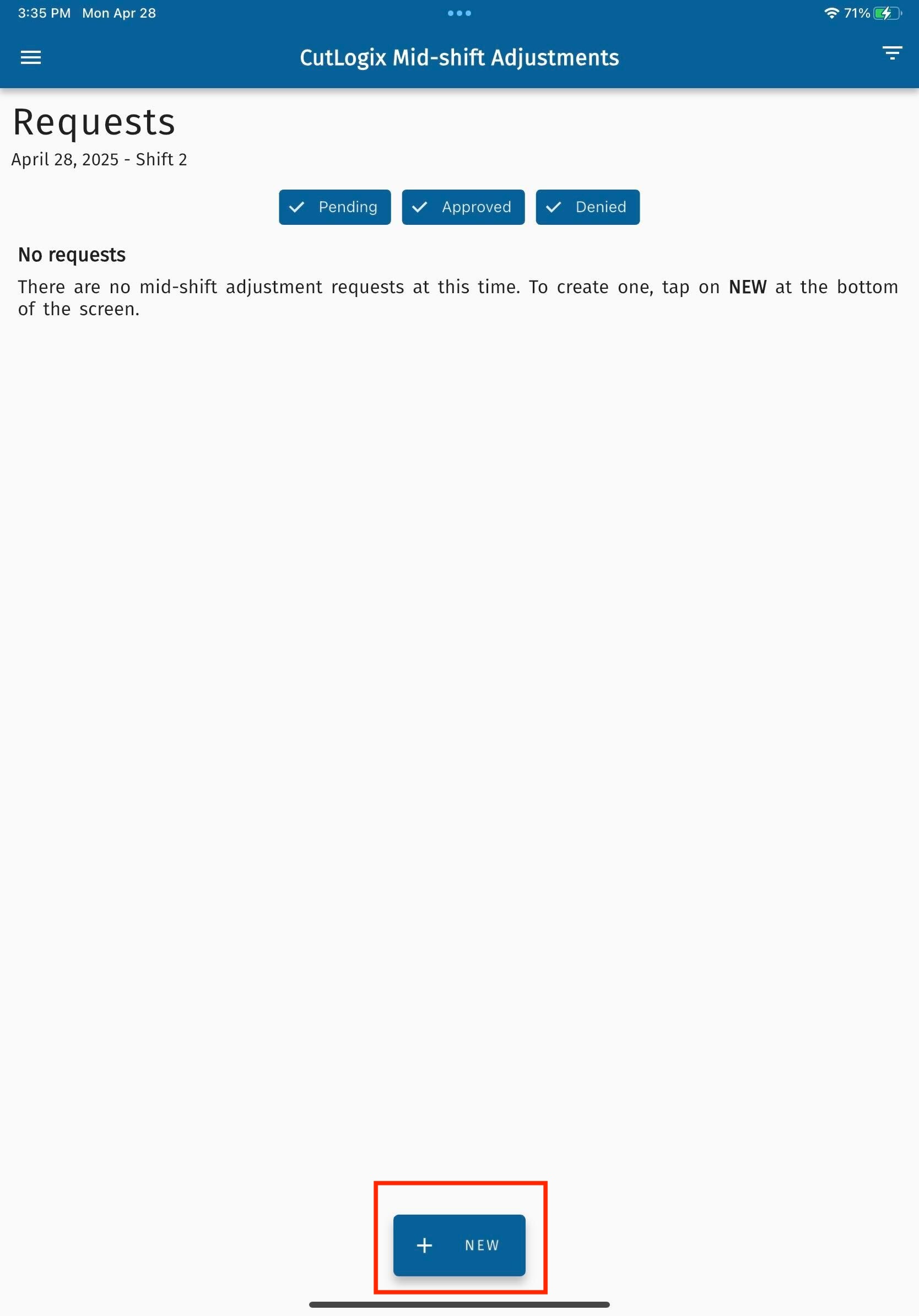 Step 2: The Mid-shift adjustments requests page will appear. Click the “+ New” button at the bottom of the page.