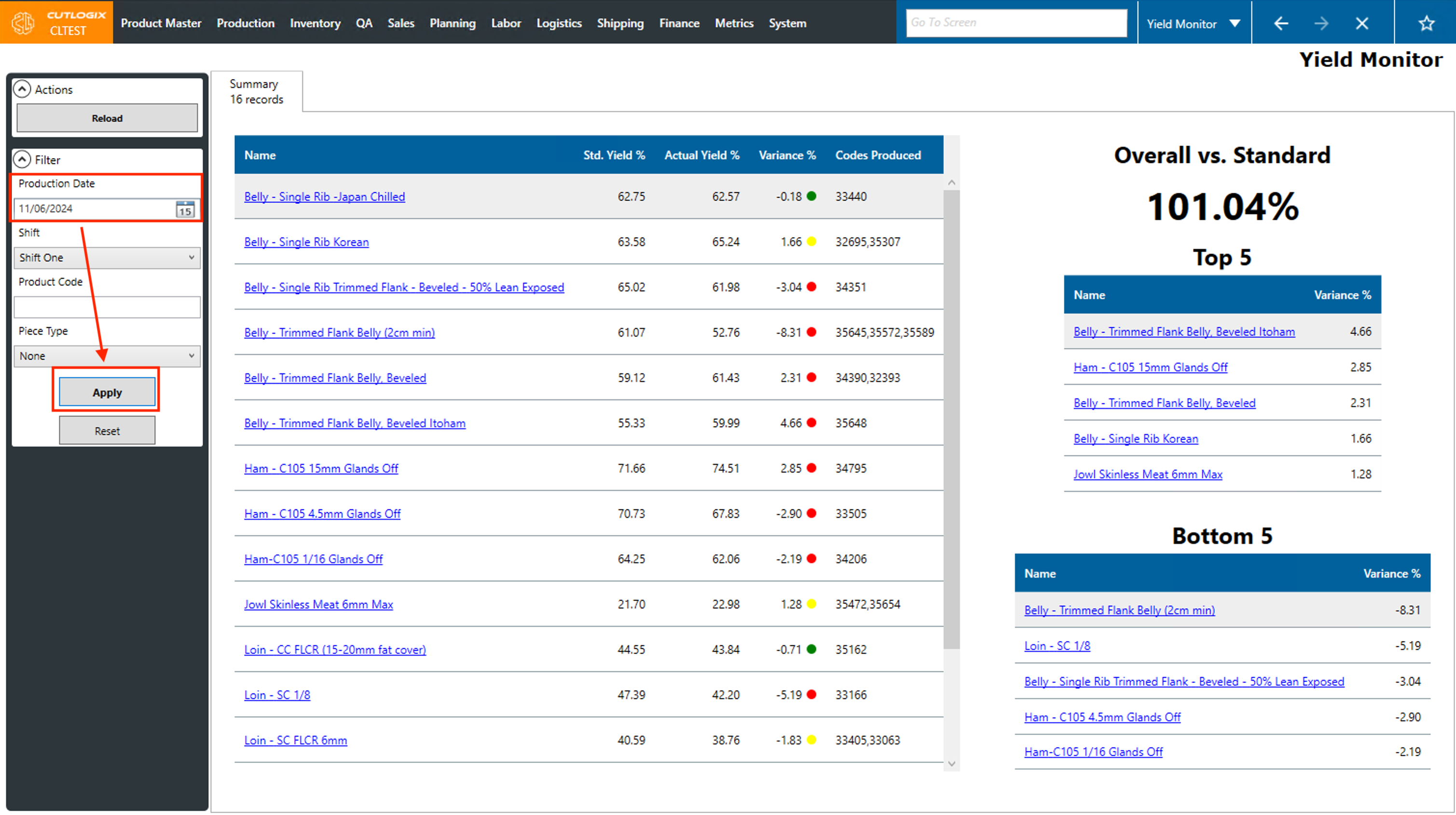 Step 2: Use the Production Date filter to select a production day to view yield data for, the click the "Apply" button.