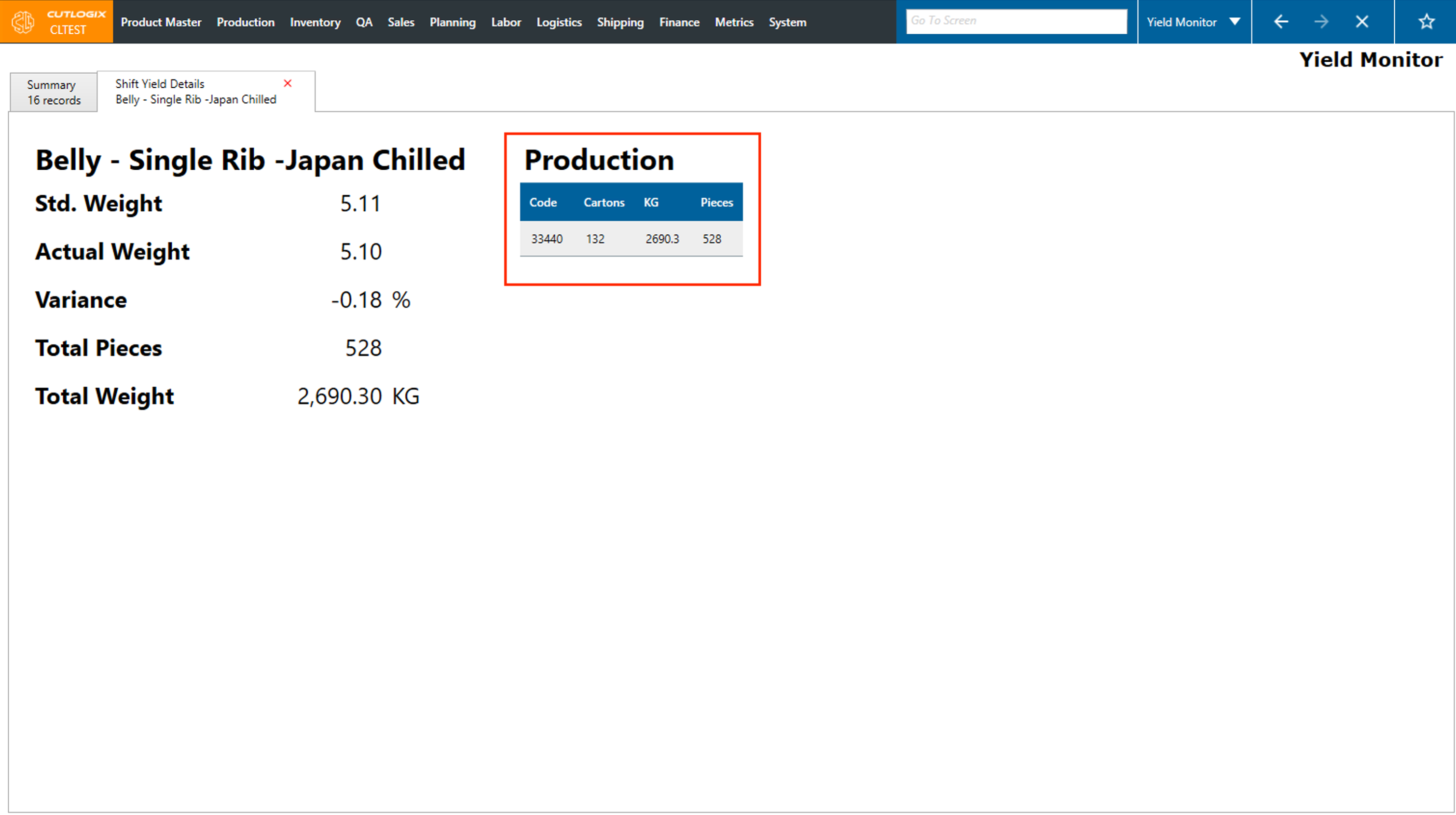 Step 5: In the production table on the right side of the page, you can view each product code that was produced on that shift as well as the number of cartons, kgs and pieces.