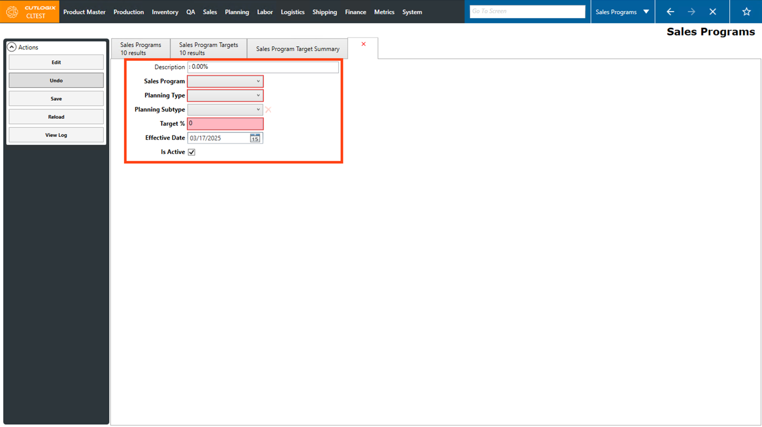 Step 4: A new tab will open for the new sales program target, where you can input information about it. Fields that are highlighted in red are required and must be entered before the target can be saved, they are as follows: