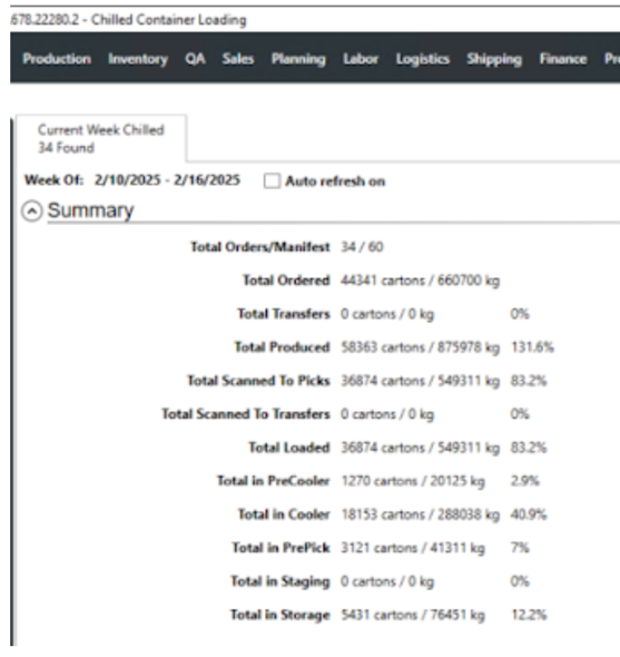 This section aggregates the production and loading data from the current week’s chilled production into useful totals. The numbers in the center provide two overall totals for the week: the Total Orders/Manifest and the Total Ordered.